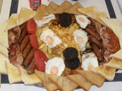 The multiple calorie feast, named the Kidz Breakfast because it weighs the same as a small child, has been polished in less than half an hour! 39 year old Robert Pinto travelled 125 miles from his home in Rutland to do the challenge in Yorkshire.