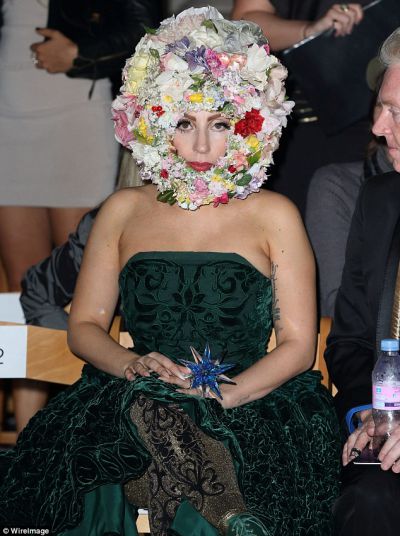 Gaga sat next to Treacy himself, chatting throughout the show. She sported a jade green prom-style dress and matched it with a giant over the top blue star-shaped ring by Swarovski. She was also joined by burlesque performer Dita Von Teese and Sex and the City actress Kim Cattrall.The singer has expressed interest at becoming an intern in Treacys design studio.
