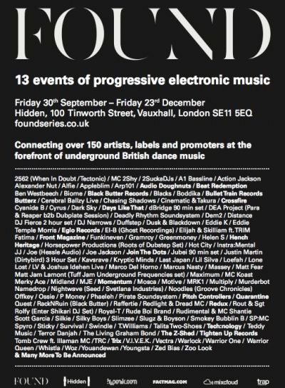 One of the biggest events of underground electronica, FOUND, will launch this autumn on the 30th September 2011. The highly anticipated event will run for a series of 13 weeks with a vast spectrum of genres unified by roots in pioneering bass music. FOUND will connect artists, promoters and labels of varied genres including progressive dubstep, dub-techno, 2-step, garage, drum and base and more!